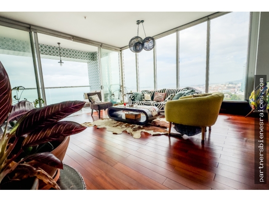El apartamento cuenta con una espectacular vista al mar y al Casco Viejo, ventanales de piso a techo, excelente iluminación natural y está finamente amoblado y decorado.